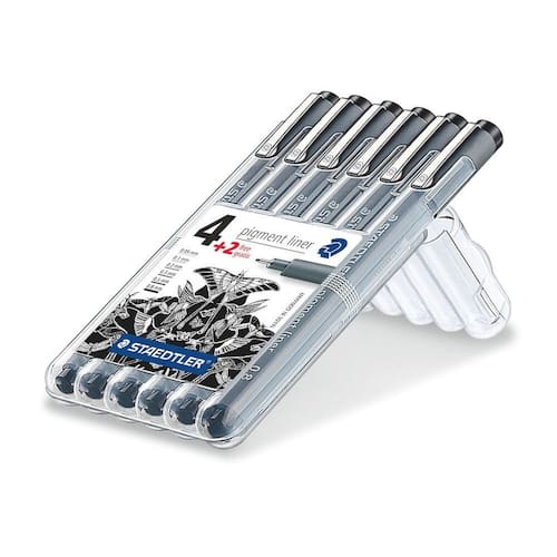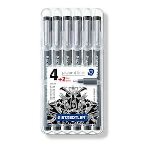 Estojo de Marcadores Pigment Liner 308 SB6P, com 6 unidades da Staedtler, de ponta comprida revestida de metal, ideal para uso com réguas e esquadros, não falsificável, não desbota e tinta pigmentada à prova d´agua. Pode ser apagada em papel vegetal, não borra quando destacada.