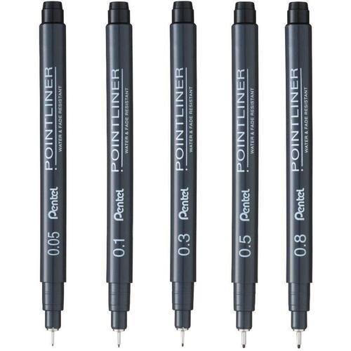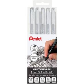 Caneta Nanquim Pointliner Kit 5 Pontas PentelEstojo com 5 canetas nanquim POINTLINER. 5 calibres. - 0,05 mm - 0,1 mm - 0,3 mm - 0,5 mm - 0,8 mm. Caneta técnica nanquim, perfeita para escrita, sketch e desenho. Resistente à água e desbotamento. Ideal para uso individual e combinações com tintas e aquarelas.
