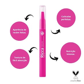 A caneta para nutrição de cutículas ricca é um produto que traz nutrição intensa para unhas e cutículas. Sua fórmula contém óleo de amêndoas, óleo de jojoba e esqualano, ingredientes reconhecidos pelo poder de hidratação. Hidrata e nutre unhas e cutículas Ajuda a fortalecer as unhas Deixa as cutículas macias e com aspecto de recém feitas Textura de fácil absorção