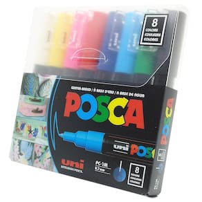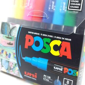 - Caneta Marcador Posca Uni-ball PC-1M - Estojo com 8 Cores Básicas - Caneta artística para lettering - Marcador multiúso. Escreve na maioria das superfícies, como cartões, cerâmica, madeira, metais, tecidos, porcelana, plástico, vidro, e muitas outras - Tinta à base de água, com alta tecnologia em pigmentação. Cores mais intensas e uma cobertura com quase 100% de opacidade. Atóxica e sem cheiro. - Espessura do traço: Aprox. de 0.7 mm