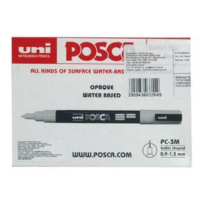 Caneta Posca Uni Ball Pc-3M Branco Com 6 Unidades Caneta com ponta de poliéster e tinta à base de àgua, podendo ser utilizada para escrever sobre a maioria das superfícies como vidro, tecido, metal, madeira, papel, cartão, entre outras. -caneta com ponta de poliéster -espessura do traço: 0.9-1.3 mm -cor da tinta: branca -tinta à base de àgua -caixa com 6 unidades -referencia: PC-3M