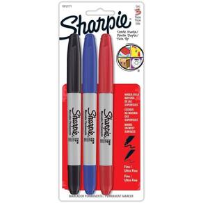 O conteúdo da embalagem inclui uma caneta sharpie vermelha ponta dupla, uma caneta sharpie preta ponta dupla e uma caneta sharpie azul ponta dupla. Com essa variedade de cores, você poderá realizar diferentes marcações e deixar sua criatividade fluir.