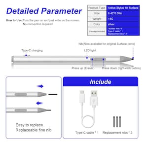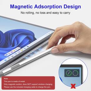 Caneta Stylus para Windows. Escreva e desenhe naturalmente. Crie sem limites. Destaques: Rejeição da palma Sensibilidade de pressão de nível 4096. Suporta 60 horas de escrita. Ponta de caneta substituível. Adsorção magnética. Botão direito do mouse e borracha Indicador de carregamento LED. Design simplificado. Botão direito do mouse e borracha Clique no botão para cima para executar a função de seleção de cores (também equivalente ao botão direito do mouse); clique no botão para baixo para ter a função de borracha, que é muito adequada para criadores que desenham. Escreva e desenhe naturalmente Esboce e sombreie com precisão com 4.096 pontos de pressão que respondem ao toque mais leve. A tinta flui da ponta da Surface Pen para a tela praticamente sem atraso. Chip inteligente integrado e dispositivo de proteção, o carregamento é seguro e estável Proteção contra curto-circuito Proteção contra excesso de energia. Proteção contra temperatura Proteção contra sobrecorrente. Proteção contra sobretensão. Proteção contra sobrecarga - Um acessório essencial para o proprietário da superfície: Caneta Surface Basta pressionar qualquer botão para começar a escrever. É compatível com Surface Pro 11/10/9/8/X/7/7plus/6/5/4/3, Surface Laptop 1/2/3/4/5, Surface Book 1/2/3, Surface GO/GO 2/GO 3, Surface Studio/Studio 2. Também é compatível com as séries ASUS/HP/Sony/Dell. Pacote: 1 caneta Microsoft com ponta, 1 cabo USB-C, 3 pontas de substituição, 1 manual do usuário (sem garantia de versão em português). - Carregamento rápido tipo C e longa vida útil da bateria: aproveitando a carga Tipo-C líder da Suejezt e maior vida útil da bateria, com apenas 30 minutos de carregamento, você obtém 60 horas de uso. Gire automaticamente no "modo de suspensão" se estiver ocioso por 10 minutos, economiza muito o consumo de energia da bateria e estende o tempo de uso. Além disso, o corpo da caneta está equipado com um indicador de carregamento LED para manter você informado sobre o status da bateria. Perfeita para estudantes, profissionais de negócios e criadores que fazem anotações e desenham com frequência. - Funções de borracha e clique com o botão direito e 3 pontas de caneta substituíveis: a caneta Surface vem com funções de borracha e clique com o botão direito do mouse, a tecla inferior é o botão direito do mouse e a tecla superior é a borracha, que ajuda você a melhorar a eficiência do seu trabalho. Basta pressionar qualquer botão para ativar a caneta de superfície e começar a escrever, sem a necessidade de Bluetooth ou drivers. Ponta fácil de substituir: 3 pontas extras para facilitar a substituição a qualquer momento. - Rejeição da palma e sensibilidade ao toque 4096: caneta Microsoft Surface com rejeição da palma da mão, permitindo que você descanse confortavelmente sua mão na tela enquanto cria, sem se preocupar com toques acidentais ou erros operacionais causados por toques não intencionais na palma da mão ou pulso. Controle fino com 4096 pontos de pressão. A tinta flui em tempo real sem atraso ou latência. Proporciona uma experiência mais suave. - Design magnético e sensação premium: o design magnético permite que a caneta de superfície seja fixada com segurança ao tablet, tornando-o mais conveniente para armazenar e localizar durante o uso. O design geral simplificado do corpo de liga de alumínio é ergonomicamente projetado e mais confortável de segurar. A caneta de superfície tem um recurso de inclinação e espessura que permite que a linha fique mais espessa à medida que a caneta é inclinada em um ângulo maior. Isso é especialmente útil para criar contornos e sombreamentos precisos.