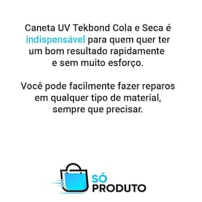Descrição Caneta uv tekbond cola e seca é uma cola indispensável para quem quer ter um bom resultado rapidamente e sem muito esforço faça reparos duradouros em segundos com a caneta uv tekbond cola e seca. Basta aplicar a resina e ativar o local com a luz uv presente na caneta para promover uma solda resistente ou preencher rachaduras. Com a caneta uv tekbond cola e seca, você pode facilmente fazer reparos em qualquer tipo de material, sempre que precisar.