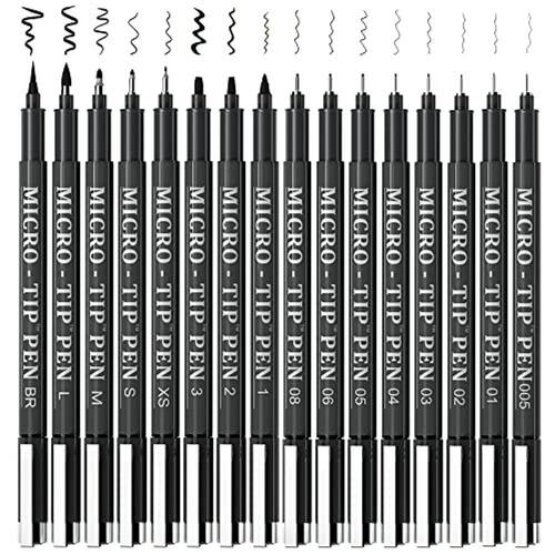 Conjunto de 16 canetas de caligrafia: 16 tamanhos diferentes de pontas de tinta preta, incluindo 005 (0,2 mm), 01 (0,25 mm), 02 (0,3 mm), 03 (0,35 mm), 04 (0,4 mm), 05 (0,45 mm), 06 (0,5 mm), 08 (0,6 mm), 1 (1,0 mm), 2 (2,0 mm), 3 (3,0 mm), XS (Extra fino), S (fino), 1* M (médio), 1* L (grande), 1* Br (pincel) para uso múltiplo.