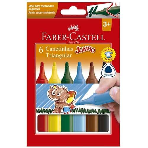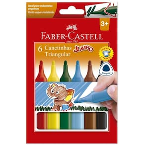 Volta às aulas ainda mais divertida com a Canetinha Colorida - Jumbo Triangular - 6 Cores - Faber-Castell! A Canetinha Colorida - Jumbo Triangular da Faber-Castell possui formato jumbo triangular: formato ergonômico ideal para mãozinhas pequenas. Ideal para o dia a dia na escola, auxiliando o aluno nas atividades de escrever e desenhar. Além disso, os produtos Faber-Castell são ideais para a escrita, desenhos, atividades, pinturas, etc. Não importa se estiver estudando ou brincando, o alto nível dos pigmentos dará vida às suas ideias criativas além de oferecer uma escrita macia e agradável.