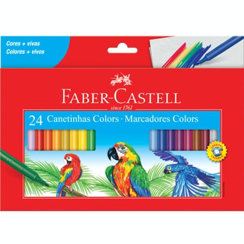 As canetinhas hidrográficas Colors da Faber-Castell estimulam a criatividade das crianças com a formulação exclusiva de corantes de alta qualidade com cores mais vivas. As canetinhas tem ponta média, a tinta é lavável e o produto é atóxico. ATENÇÃO! Não recomendável para crianças de até 3 (três) anos, por conter parte(s) pequena(s) que pode(m) ser engolida(s) ou aspirada(s). Produto atóxico e não perecível. Características: - Formulação exclusiva de corantes de alta qualidade - Cores mais vivas - Ponta média - Tinta lavável - Produto atóxico e não perecível Especificações Marca: Faber-Castell Modelo: Colors Código: 15.0124CZF Cores: 24 Cores Produto contém: Estojo com 24 Cores Registro Inmetro: 003638/2012 Sobre a Faber-Castell Líder mundial na produção de EcoLápis de madeira reflorestada, a história da Faber-Castell se confunde com a própria criação do lápis. Fundada em 1761 na Alemanha, hoje a empresa possui escritórios em mais de 100 países. No Brasil, onde está presente desde 1930, três fábricas (São Carlos-SP, Prata-MG e Manaus-AM) e 9.600 hectares de floresta cultivada (também em Prata-MG) são as responsáveis pela produção de 2 bilhões de EcoLápis por ano. Com mais de 70 mil postos de venda no Brasil, exporta também para mais de 70 países. Seu portfólio inclui: EcoLápis de cor e de grafite, giz de cera, tintas escolares, canetinhas hidrográficas, apontadores, borrachas, canetas, lapiseiras, kits criativos, produtos artísticos, instrumentos e acessórios de luxo para a escrita. Ean: 7891360611318
