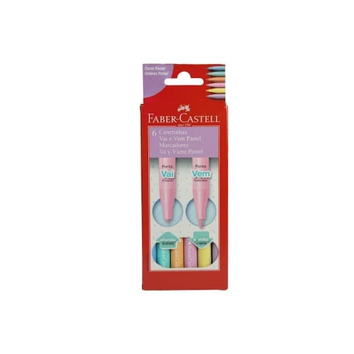 Canetinha Vai e Vem Pastel 6 Cores Faber-Castell Caneta hidrográfica ideal para desenhar e pintar em papéis em geral em tons pasteis. Possui 6 canetinhas vai e vem, resistentes, feitos com materiais ecológicos com sistema exclusivo que protege a ponta contra impactos, garantindo maior durabilidade. Conta com espaço para escrever o nome da criança, evitando perdas. Tinta lavável na maioria dos tecidos. Especificações: - Marca: Faber-Castell; - Linha: Canetinha Hidrodráfica Vai e Vem; - Tampa antiafixiante; - Tinta Lavável e o produto é atóxico; - Tecnologia com sistema de amortecimento contra impactos na ponta; - Maior resistência e durabilidade. Conteúdo da Embalagem: 6 Canetinhas Vai e Vem Pastel. Recomedações: Não recomendável para menores de 3 três anos por conter peças pequenas que podem ser engolidas ou aspiradas. ---------------------------------- Olá tudo bem Você acaba de consultar seu produto em uma loja especializada que atua no mercado a mais de 20 anos. Somos a starvox, uma distribuidora de produtos para papelaria e informática. Temos um com mais de 500 itens das linhas: Mídias cd/dvd, pen drive, cartão de memória, estojos para cd, dvd e blu-ray, teclados, mouses, headsets, fones de ouvido, caixa de som, limpadores, cabos, pilhas, baterias, utilidades domésticas, iluminação, marcadores, canetas, papéis, lápis de cor, artigos de papelaria em geral.