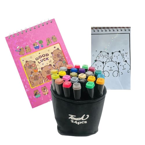 Este kit já acompanha um conjunto com 24 canetinhas coloridas, ou seja, você não precisa se preocupar com nada! É só abrir e começar a colorir!