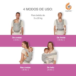 - 4 (Quatro) posições de transporte – voltado para dentro (0m+), voltado para fora (5m+), transporte no quadril (6m+) e transporte nas costas (6m+)
