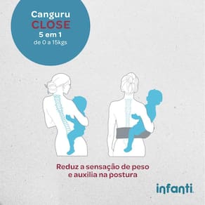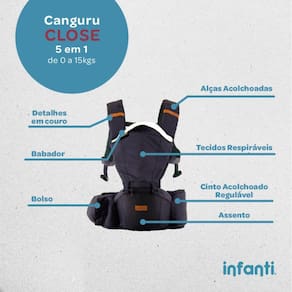O Canguru Close 5 em 1 nos traz a solução completa para proximidade e conforto nos passeios ou em qualquer momento que precisarmos. Com 5 modos de uso: apoio para o recém-nascido; com encosto e o bebê virado para os pais ou para o mundo; como banquinho para carregar os maiorzinhos ou nas costas.