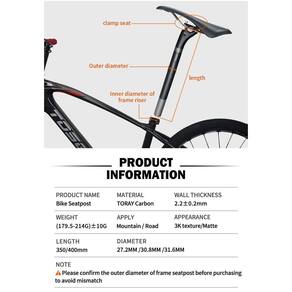 Marca: TOSEEK Material: Braçadeira Liga do Tubo + Alumínio do Carbono Deslocamento: 20 mm Tamanho do comprimento: 400 mm Diâmetro: 27.2 mm Acabamento: Carbon 3K Matte Carga Máxima: 120 KG