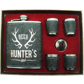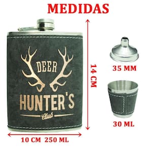 COR: Preto e Prata; MEDIDAS: Altura 14cm X Largura 10cm X 250ml; MATERIAL: Couro e Aço Inoxidável; 4 Copos 30ml; 1 Funil 35mm; CONTEÚDO DA EMBALAGEM:
