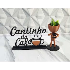 Cantinho do café com vaso bob em pé robert plant cobre preto Composição do kit: 1 base do letreiro removível com aproximadamente 17cm de largura 1 bob em pé bebendo café com aproximadamente 13cm s/considerar as plantas Obs. Já acompanha as plantinhas artificiais