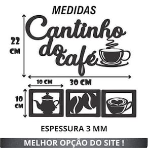 Cantinho do café kit 4 peças decoração geek cozinha mdf 3mm pretoTamanho: Cada quadro: 10cm x 10cm largura x altura . Os 3 quadrinhosO maior tem 22 altura 30 se larguraQuantidade de quadros: 4 unidades.Aplicação: Para aplicar o produto basta posicionar a fita dupla face 3m enviada junto com o produto . A aplicação pode ser feita em qualquer parede que seja lisa, fosca e sem indícios de irregularidade. Informações adicionais: Material: mdfEspessura: 3mm Cor: preto Acabamento: foscoEnvio com embalagem reforçada Cuidados:- não molhar;- evitar quedas;- não expor diretamente ao sol;- utilizar em ambientes internos;- limpar com pano seco ou levemente umedecido; As cores podem sofrer uma pequena variação de acordo com o seu monitor. Marca: Viza 3D Games