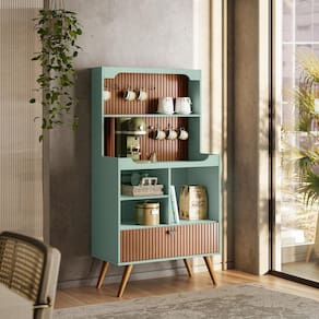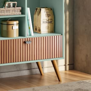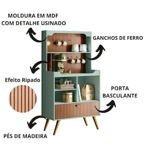 Cantinho do Café Rubi - é ideal para sua Cozinha! Com designer Retrô ele irá agregar muito mais charme e requinte ao seu ambiente. Possui o Efeito Ripado Em Tauari, com porta basculante, gancho de ferro e prateleiras para amazenamento. Amplo tampo para acomodar seus objetos de decoração, xícaras etc. Elaborado em MDF usinado com pés em madeira maciça, esses atributos garantem ao produto maior resistência e durabilidade.