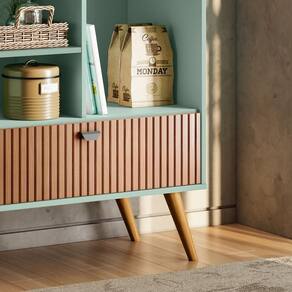 Transforme seu ambiente com o Cantinho do Café Rubi, um móvel sofisticado e funcional, perfeito para dar um toque retrô e requintado à sua cozinha ou espaço gourmet. Seu efeito ripado em Tauari traz um charme exclusivo, enquanto a porta basculante, ganchos de ferro e prateleiras proporcionam ótima organização para utensílios, xícaras e objetos decorativos. Produzido em MDF usinado e com pés em madeira maciça, garante durabilidade e resistência, tornando-se o complemento ideal para um cantinho do café elegante e funcional.