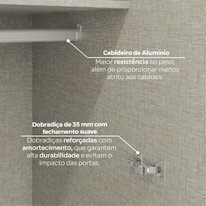 Diferenciais: Puxador em alumínio, dobradiças metálicas, calceiro de alumínio, módulo 13 cm afastado da parede.