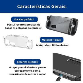 A capa é projetada para oferecer acesso fácil e rápido a todos os botões e portas do seu console, permitindo que você use o dispositivo sem precisar retirá-lo da capa.
