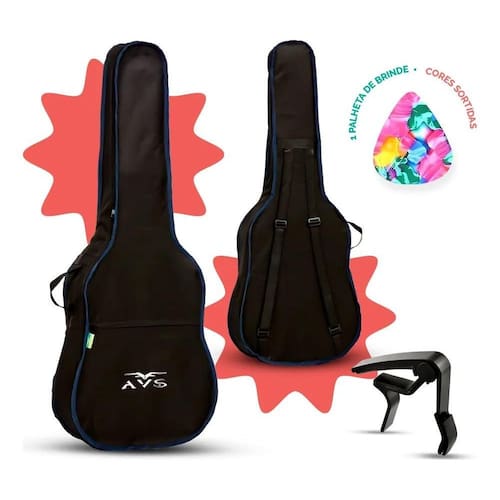 Entrega segura e ágil Total suporte no pós-vendas Itens inclusos na embalagem: 01 capa para violão folk simples avs 01 capotraste para violão Características capa avs: Marca: avs Medidas: 106x43x12 Modelo: folk simples avs sem espuma Cor: preta Material: poliester Produzida em alta resistência Tecido reforçado para maior durabilidade e segurança. Compatível com: violão clássico e violão Folk Acabamento externo: lona extra Zipper reforçado em toda a lateral do instrumento Alça de mão Alças na costa tipo mochila para carregar Bolso externo com zipper Fabricante: avs bags Fabricado no brasil Especificações capotraste: Marca: groove Modelo: cp10 Dimensões da embalagem: 16.4 x 11 x 2 cm; 140 g Cor: preta Compatível com: violão e guitarra Especificações palheta: Marca: groove Espessuras: 0.71mm Modelo: abs Cor: Palheta maciça e flexível 1 unidade Outras informações: : 90 dias contra defeitos de fabricação. Itens inclusos na embalagem: 01 capa para violão folk simples avs 01 capotraste para violão Postaremos o produto em até 24hrs após confirmação de pagamento. Qualquer dúvida ficaremos contentes em responder. Boas compras e volte sempre Marca: Não Informado