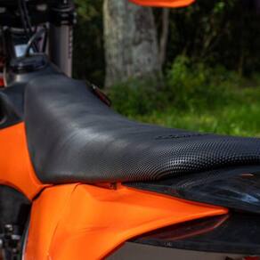 O diferencial da capa de banco é que não possui costuras, micros pirâmides mais aderente e resistente. Com efeito emborrachado e antiderrapante de última geração que dão ao piloto um excelente controle na gestão de sua posição e mais liberdade de movimento.