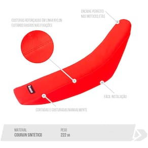 É fabricado em courvin sintético especial, que proporciona resistência, durabilidade e grip acima da média para o banco de sua moto.