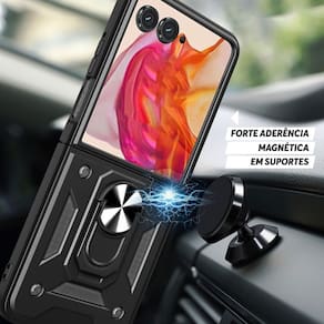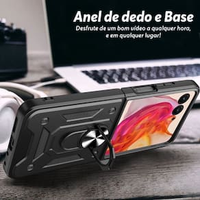 Capa protetora blindada com suporte metálico giratório 360º e tampa deslizante para lente. Alta proteção antichoque e anti-impacto com design moderno e funcional. Encaixe preciso com recortes para botões e entradas.Tipo