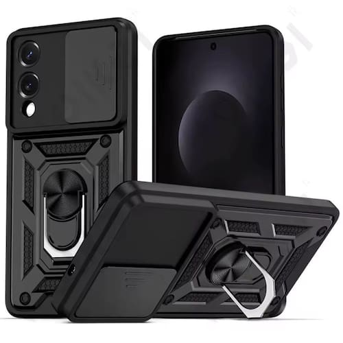 Capa protetora blindada com suporte giratório e tampa deslizante para lente.Acabamento do material