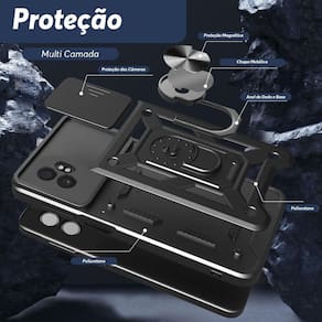 Capa protetora blindada com suporte e tampa de lente, alta proteção e funcionalidade. Estrutura robusta em camadas que absorve impactos. Tampa deslizante para lente protege as câmeras. Suporte metálico giratório 360º funciona como apoio de mesa e é compatível com suporte magnético veicular. Design moderno e funcional com detalhes em relevo. Encaixe preciso com recortes para botões, entradas e câmera.Tipo