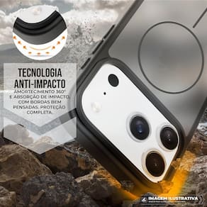 Com compatibilidade total com a tecnologia MagSafe, a capa conta com anel magnético integrado, garantindo encaixe seguro com carregadores e acessórios magnéticos, além de permitir recarga prática sem a necessidade de removê-la.