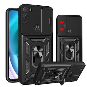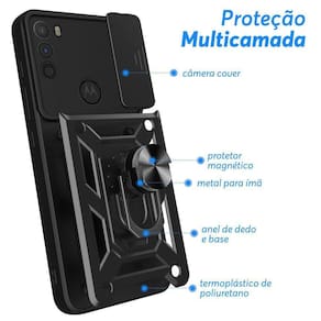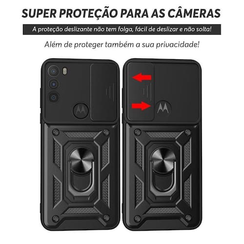 Especificações técnicas: - Cor: preto - Alta proteção - Ótimo acabamento com alto relevo na parte que protege a câmera - Dupla resistência - Proteção anti impacto de dupla camada - Multi-funções - Anel de dedo e metal embutido para aderir em imã - Base ajustável para função de base - Encaixe 100% perfeito - Slide cover para maior proteção das câmeras e privacidade - Compatível com Motorola Moto G71 - Não serve em outras versões