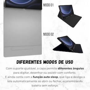 Capa com imã encaixe teclado para galaxy tab s9 fe 10.9 x516 Cor: preto a capa magnética com suporte ajustável oferece segurança, praticidade e organização para você trabalhar, estudar ou se divertir em qualquer lugar. produzida com materiais premium, combina resistência e leveza: alta qualidade, estrutura interna rígida que absorve impactos e interior em microfibra macia, que evita riscos na tela e no corpo do tablet. além disso, cobre a frente, verso e bordas do dispositivo para garantir máxima segurança no dia a dia o slot dedicado para a caneta touch e o encaixe magnético para teclado tornam a experiência ainda mais organizada e funcional. e mais: conta com suporte ajustável para diferentes ângulos e função auto sleep/wake para economizar bateria automaticamente ao abrir ou fechar a capa. ------------------ ------------------ é compatível com quais modelos de tablet R: compatível somente com o samsung galaxy tab s9 fe 10.9 modelos sm-x516 e sm-x510 . Antes da compra, verifique o modelo do seu tablet para evitar incompatibilidade. o suporte é firme Dá para usar em várias posições R: sim a capa possui suporte ajustável, permitindo diferentes ângulos para digitar, desenhar ou assistir vídeos com estabilidade e conforto. a capa cobre também as bordas do tablet R: sim. Ela cobre e protege frente, verso e bordas, proporcionando proteção completa para o seu dispositivo. o teclado e a caneta estão inclusos R: não. Este anúncio refere-se apenas à capa. O teclado e a caneta são vendidos separadamente. posso usar um teclado bluetooth com essa capa R: sim se você preferir, pode usar qualquer teclado bluetooth com ou sem ímã junto com a capa, sem problema algum. ------------------ Especificações ------------------ Material de alta resistência Fácil de limpar Interior de microfibras Encaixe para caneta Altura: 19 cm Largura: 26 cm Capa aberta: 45 cm Compatibilidade: samsung galaxy tab s9 fe 10.9 modelos sm-x516 e sm-x510 ------------------ Conteúdo ------------------ 1x capa magnética Anúncio referente a capa Acessórios que ambientam as fotos não inclusos. ------------------ Apresentação: ------------------ - qualidade garantida. - atendimento qualificado. - enviamos para todo o brasil. - compra garantida. - despachamos em até 1 dia útil após confirmação do pagamento Garantimos a devolução por arrependimento em até 7 dias, após o recebimento e de 15 dias contra defeitos de fabricação. Marca: Não Informado