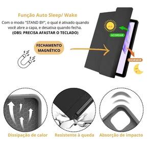 - recursos como fechamento magnético: Para maior segurança, dissipação de calor para evitar superaquecimento e absorção de impacto para proteger seu tablet de danos, você pode se sentir confortável e confiante em qualquer situação. Além disso, a função autosleep economiza energia, desligando automaticamente o teclado quando não estiver em uso.
