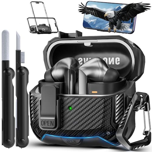 Dispositivo compatível: esta capa com clipe de bloqueio seguro para Samsung Galaxy Buds3/Galaxy Buds3 Pro (2024) capa de carregamento. - Dispositivo compatível: esta capa com clipe de bloqueio seguro para Samsung Galaxy Buds3/Galaxy Buds3 Pro (2024) capa de carregamento. - ?Design inovador? Novo design de trava de segurança, com a função de bloqueio + suporte de telefone, abra a trava e você pode ter um suporte de telefone para assistir ao seu telefone, conversar por vídeo ou assistir a filmes. Capa com trava de tampa para fechamento completo. É muito prático. - ?Design de bloqueio seguro atualizado?Possui travas seguras. Para que elas se fechem facilmente, a trava oculta mantém sua capa sempre fechada firmemente, basta pressionar o botão "Abrir", fácil de operar, design mais seguro e prático. - Design de proteção total: é feita de TPU + policarbonato, capa rígida de TPU e textura de fibra de carbono, projetada para proteger totalmente. - ?Caneta de limpeza 3 em 1?: a caneta de limpeza com ponta de caneta, escova macia e a escova flocagem de alta densidade, pode ajudar você a remover poeira e sujeira de seus fones de ouvido, sempre mantenha seu Samsung Galaxy Buds 3 como novo. - ?O pacote inclui?: 1 capa compatível com Samsung Galaxy Buds3/Galaxy Buds3 Pro (2024), 1 caneta de limpeza, 1 chaveiro.