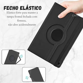 A função giratória da capa permite que você alterne facilmente entre os modos paisagem e retrato, adaptando-se às suas necessidades de visualização e uso. Ela também possui um fecho magnético embutido, que mantém a capa firmemente fechada quando não está em uso, garantindo a proteção do seu tablet.