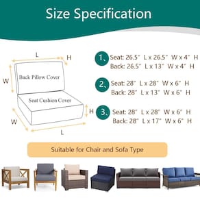 - Tamanho do conjunto de capas de almofada de assento ao ar livre: capa de almofada de assento profundo x 2 peças: 71 cm C x 71 cm L x 15 cm A, capa de almofada de encosto x 2 peças: 71 cm C x 33 cm L x 15 cm A. CAPA SOMENTE. A almofada de assento é projetada com uma meia parte traseira flexível para facilitar o uso e remoção