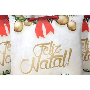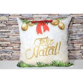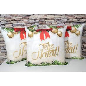 Linda capa de almofada em tecido poliéster, com fundo palha, estampas de laços e bolas natalinas, em tons de vermelho, dourado e verde, com fechamento em ziper em uma das laterais.