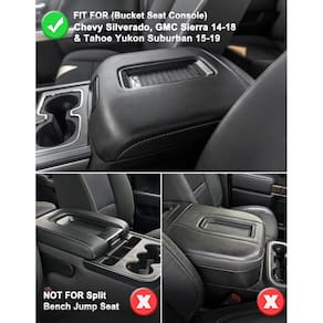 Descrição: ? Novo na embalagem (nunca foi utilizado ou instalado) ? Esta é uma capa de console, não é necessário usar ferramentas para instalar. ? Ajuste direto ao seu carro específico. ? As fotos são tiradas por produto real Especificação: ? Material: couro de vinil ? Peso do produto (lbs): 0,64 ? Cor: Preto ? Característica especial: Resistente à água e a arranhões Guia de instalação: Limpe o console e deslize esta almofada no console, ajuste a capa com faixas elásticas na parte traseira. Incluído na embalagem: ? 1 * capa de apoio de braço Observação: ? Verifique o tipo de veículo antes de comprar. Obrigado pela sua compreensão! ? Não hesite em entrar em contato conosco se tiver algum problema com esses produtos. Ficamos felizes em responder a qualquer pergunta! - Acabamento personalizado - Esta almofada de console central de assento bucket atende ao padrão Autêntico que é requintadamente trabalhada, bem compatível com Chevy Silverado, GMC Sierra 1500 2500 3500 2014 2015 2016 2017 2018, Tahoe Yukon Suburban 2015 2016 2017 2018 2019 2020, console de chão com assento concha - Dirija com conforto – Feito de couro de vinil superior e esponja, macio ao toque e fornece um bom suporte para seus cotovelos, você pode sentir os braços relaxados durante a condução - Resistente a arranhões e água – Proteja a tampa do console do meio, envolvendo o compartimento para manter limpo e evitar arranhões de garras ou chaves de animais de estimação - FÁCIL INSTALAÇÃO - Você pode facilmente deslizar a almofada no console sem qualquer ferramenta. Existem 2 faixas elásticas na parte de trás que ajudam a se manter no lugar, sem deslizar para frente e para trás - CONTEÚDO DA EMBALAGEM - 1 x capa de apoio de braço. O console e a tampa ilustrados não estão incluídos