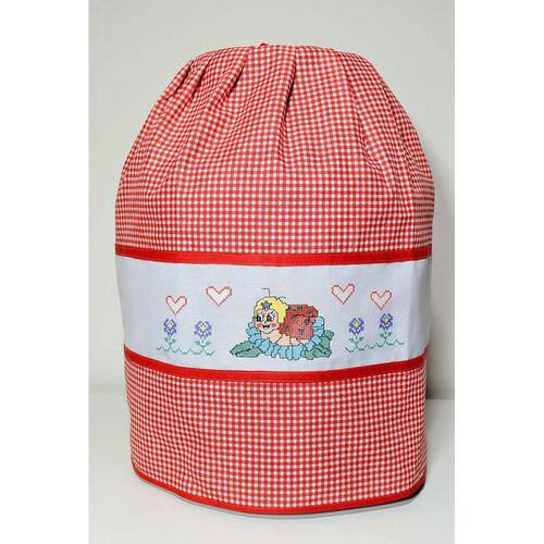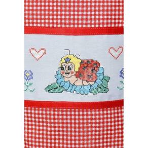 Capa confeccionada em tecido xadrez vermelho, com um lindo barrado branco bordado em ponto cruz de joaninhas e corações, nas cores vermelho, verde, amarelo, azul e preto, detalhes em viés na cor vermelho.