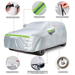 - Detalhes do design: 1: Com zíper de porta à esquerda para facilitar o acesso. 2. Pulseiras à prova de vento na frente e na traseira para fixar a capa do carro em dias de vento forte. 3. Listras refletivas para lembrar as pessoas à noite. 4. Lindos bolsos espelhados protegem perfeitamente o espelho de danos. 5: As bainhas elásticas ajustáveis na parte inferior permitem que você ajuste o tamanho facilmente. 6: Quatro amarras ajudam você a amarrar a capa às quatro rodas. Não se preocupe em soltar em um dia ventoso
