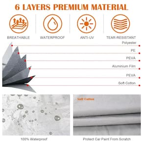 - Materiais premium: 1: Feito de PE externo e poliéster prateado, que é 100% impermeável, 2: alumínio de alta reflexão é bom em proteção solar, mantém o carro fresco em dias ensolarados. 3. Forro interno de algodão mais espesso para proteger a pintura do seu carro