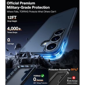 - Proteção avançada, nível militar: a estrutura de amortecimento de ar TORRAS X-Shock e o material de TPU altamente resiliente oferecem proteção de nível militar para garantir que seu telefone fique coberto por todos os lados. A tela delicada e a lente da câmera são protegidas por molduras elevadas de 1,7 mm e 1,2 mm, evitando efetivamente arranhões ou danos acidentais. Rigorosamente testada mais de 4000 vezes, esta capa de telefone S25 plus se despede das rachaduras da capa e dos arranhões da câmera, proporcionando total tranquilidade mesmo durante choques e quedas.