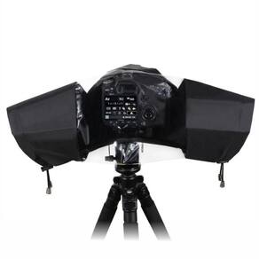 Proteja sua câmera fotográfica DSLR contra chuva e respingos com a capa de chuva RV-66 da Greika. Ela é confeccionada em nylon impermeável e possui duas mangas laterais ajustáveis para as mãos, permitindo manusear a câmera com conforto. A parte traseira é feita em plástico transparente, que permite visualizar a tela LCD e os controles da câmera.