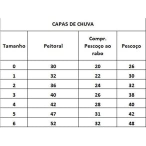 Você pode escolher o tamanho da capa de chuva de acordo com as medidas das costas - comprimento do pescoço até o rabo - e da largura do peitoral do seu cachorro. Consulte a tabela de tamanhos disponível junto às fotos do produto para fazer a escolha correta.