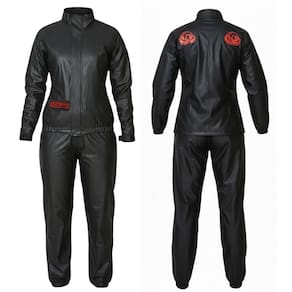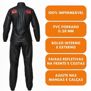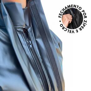 Conjunto Feminino de chuva confeccionado em PVC forrado 100% Impermeável, composto por blusão de segurança com gola alta, mangas longas raglãn com ajuste no punho por veIcro, fechamento frontal por meio de zíper e veIcro, carcela interna para proteção do zíper, bolso interno, bolso externo no peito com tampa fechada por veIcro, refletivo nas costas e na tampa do bolso. Calça de segurança com elástico e cordão interno, zíper nos tornozelos para ajustes.