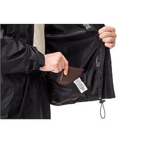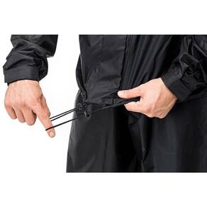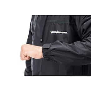 Um conjunto formado por jaqueta e calça tamanho GG, ambos com refletivos de segurança e fabricados em nylon de 0,19 mm.