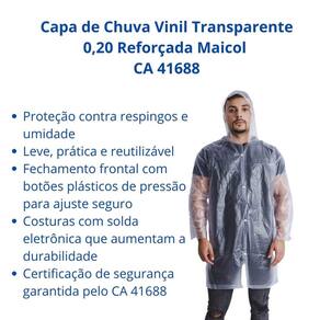 Capa de Chuva Vinil Transparente 0,20 Reforçada Obra Maicol CA 41688 A capa de vinil transparente Maicol é confeccionada em vinil laminado de alta qualidade com 0,20 mm de espessura, oferecendo proteção prática e eficiente contra respingos e umidade durante atividades com uso de água.