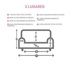 03 lugares -altura total do sofá: 1,10 m -altura máxima do braço: 80 cm - altura máxima do encosto: 90 cm -profundidade máxima do assento: 60 cm - largura do braço do sofá: 40 cm - largura máxima do assento: 1,80 m - largura total do sofá: 2,40 m