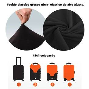 Material: suplex elástico, lavável e resistente Fechamento: fecho tipo click Cores Disponíveis: Preta, Azul, Cinza e Rosa Tamanhos e medidas aproximadas (altura x largura): P: 49 cm x 33 cm - indicado para malas de até 15 kg M: 58 cm x 37 cm - indicado para malas de 15 a 17 kg G: 65 cm x 47 cm - indicado para malas de 18 a 24 kg