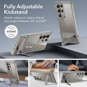 ESR Capa para Samsung Galaxy S24 Ultra, capa com suporte S24 Ultra com 3 modos de suporte, proteção contra quedas de nível militar, capa fina à prova de choque com suporte patenteado, série Boost, cinza claro - Compatibilidade: apenas para Samsung Galaxy S24 Ultra; suporta carregamento sem fio com a capa - 3 modos de suporte: use as mãos livres e desfrute de um ângulo de visualização mais confortável escolhendo entre 3 modos de suporte estáveis para a família FaceTime em retrato ou acompanhe seus programas favoritos em paisagem - Suporte altamente ajustável: o design patenteado dá a você a liberdade de escolher qualquer ângulo de até 60 graus, enquanto a dobradiça durável é testada em laboratório para permanecer forte por mais de 3.000 usos - Proteção de nível militar: cantos de proteção aérea com absorção de choque, bordas elevadas da tela e protetor de câmera significam que esta capa para Galaxy S24 Ultra oferece proteção certificada de teste contra quedas, batidas e arranhões - Transparente: esta capa para Galaxy S24 Ultra com suporte tem uma parte traseira de acrílico rígido que resiste a amarelecimento e arranhões para mostrar o verdadeiro estilo do seu telefone com uma clareza deslumbrante que dura